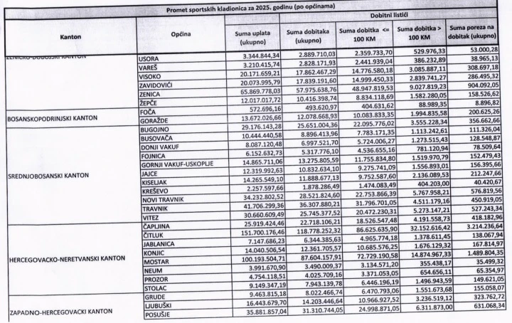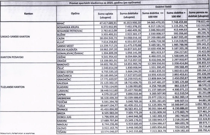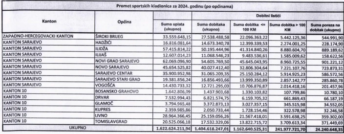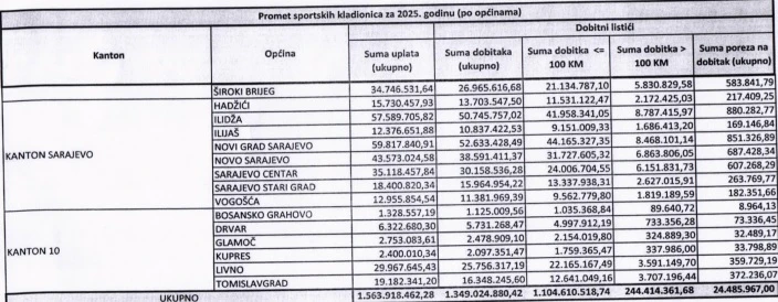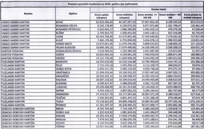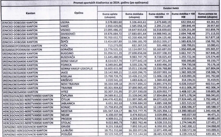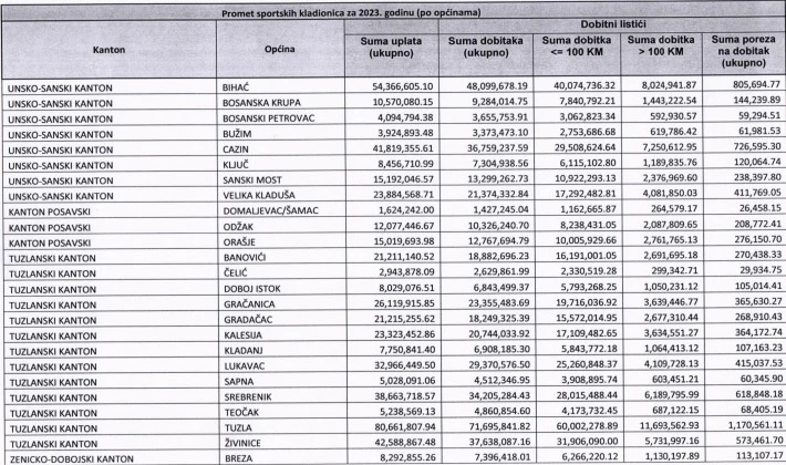 Kada se pogledaju podaci Porezne uprave FBiH, može se vidjeti da je recimo u Čitluku 2023. godine u kladionicama uplaćeno 141,4 miliona KM, u Mostaru 106,8 miliona KM, Tuzli 80,6 miliona KM, Zenici 75,7 miliona KM, sarajevskoj općini Novi Grad 67,2 miliona KM, na Ilidži 55,9 miliona KM, u Novom Sarajevu 48,4 miliona KM, Bihaću 54,3 miliona KM…