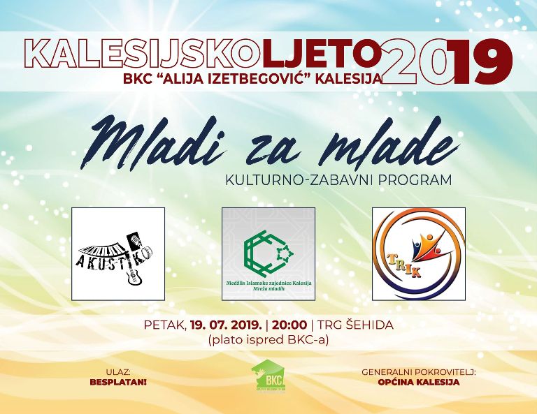 Tradicionalna kulturno-zabavna manifestacija „Kalesijsko ljeto“, koju organizuje Bosanski kulturni centar „Alija Izetbegović“ Kalesija, počinje u petak, 19. jula u 20:00 sati. Organizator se, kao i svaki put do sada, potrudio da obezbijedi bogat i šarolik kulturno-zabavni program. Tako će ovogodišnje „Kalesijsko ljeto“ početi kulturno-zabavnim sadržajem nazvanim „Mladi za mlade“, a priliku da se predstave publici imat će članovi nedavno osnovane NVO Trik Kalesija, zatim Mreža mladih Medžlisa islamske zajednice Kalesija sa svojim horom, te kalesijski bend Akustiko, mlada pjesnikinja Melisa Brkić, Sead Đedović i drugi. Program će se izvesti na otvorenom, na Trgu šehida – plato ispred BKC-a, a u slučaju nepovoljnih vremenskih prilika u sali BKC-a.