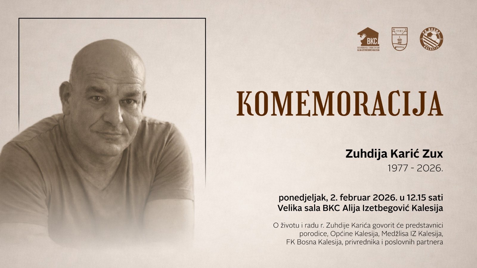 O životu i radu velikog čovjeka Zuhdije Karića govorit će predstavnici porodice, Općine Kalesija, Medžlisa IZ Kalesija, FK Bosna Kalesija, privrednika i poslovnih partnera.