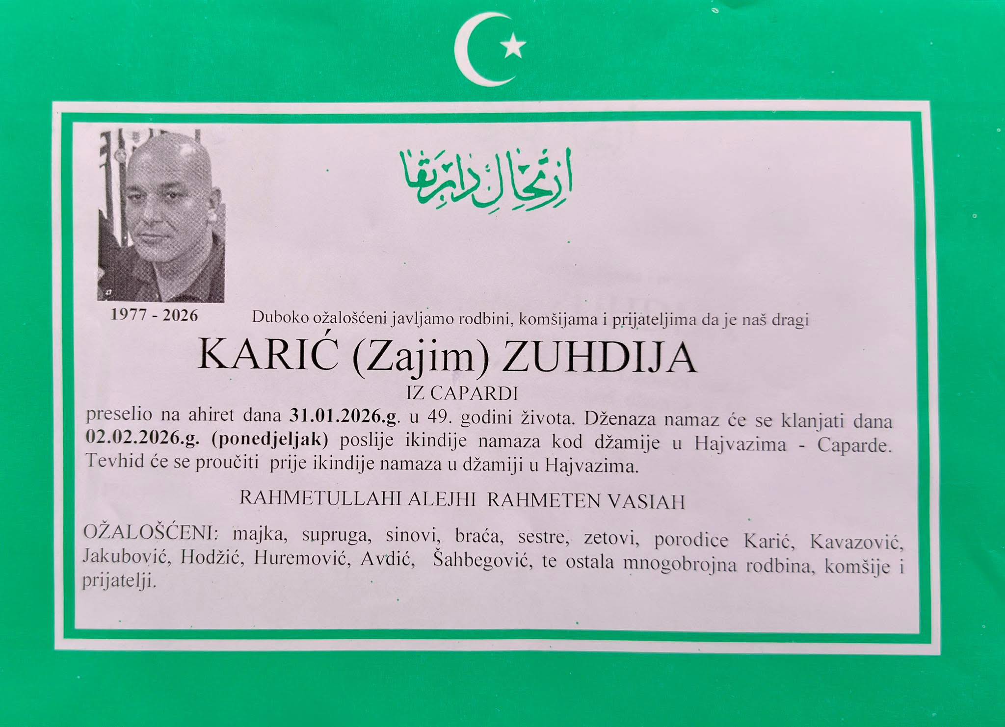 Dženaza-namaz obavit će se u ponedjeljak, 2. februara 2026. godine, poslije ikindije, kod džamije u Hajvazima – Caparde.