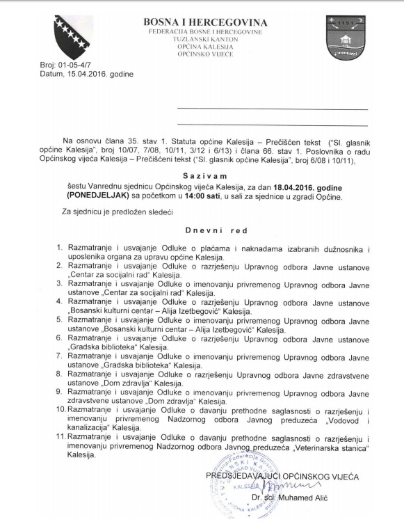 Za ponedjeljak (18.04.2016.) zakazana je 6. vanredna sjednica Općinskog vijeća Kalesija.