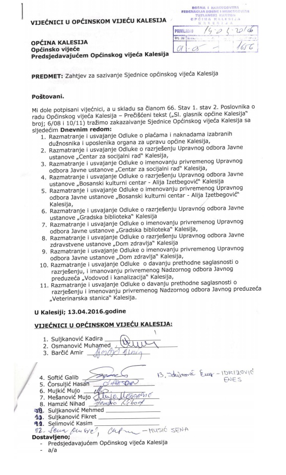 Sjednicu je zakazao novi predsjedavajući OV Kalesija, Muhamed Alić, nakon što je 13 vijećnika uputilo Zahtjev za održavanjem Sjednice Općinsko vijeće.