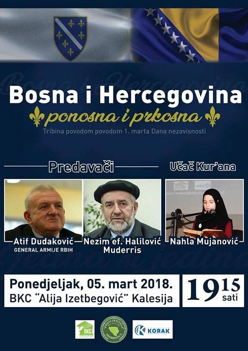 Povodom obilježavanja Dana nezavisnosti u ponedjeljak, 5. marta, sa početkom u 19,15 sati, u sali kalesijskog BKC-a održat će se tribina „Bosna i Hercegovina ponosna i prkosna“.