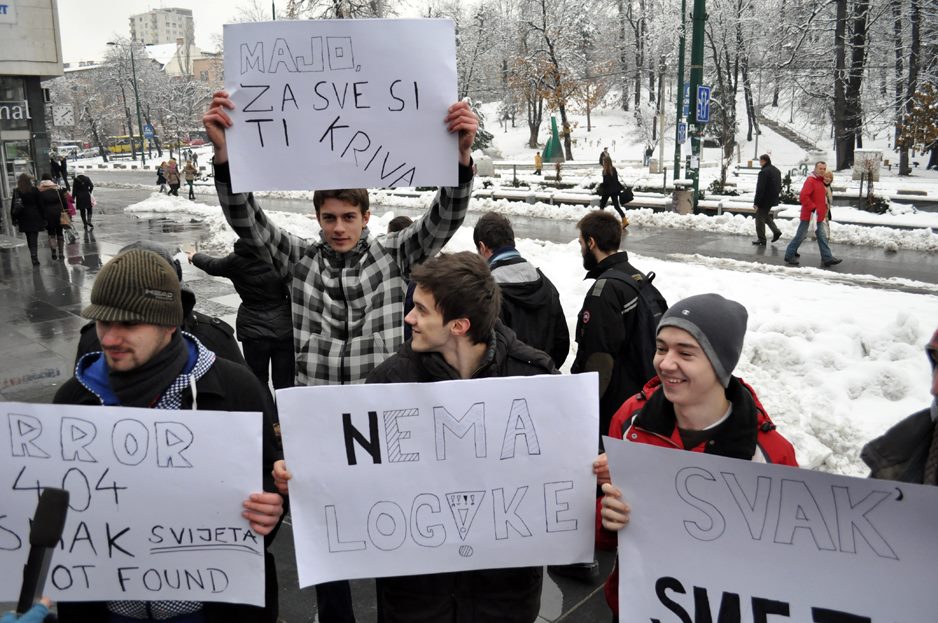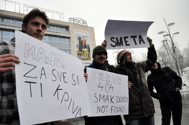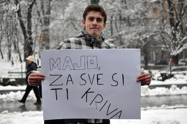 Mladići su držali šaljive parole “Svak’ smeta”, “Majo, ti si kriva za sve” i druge.