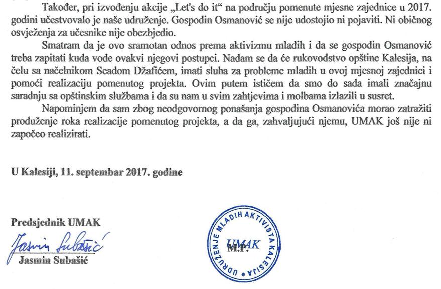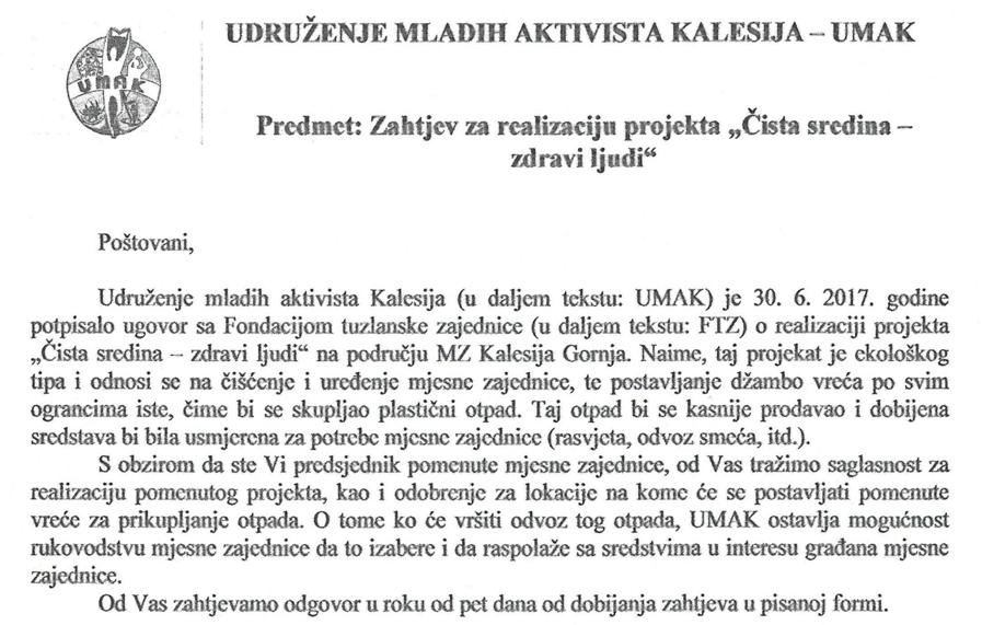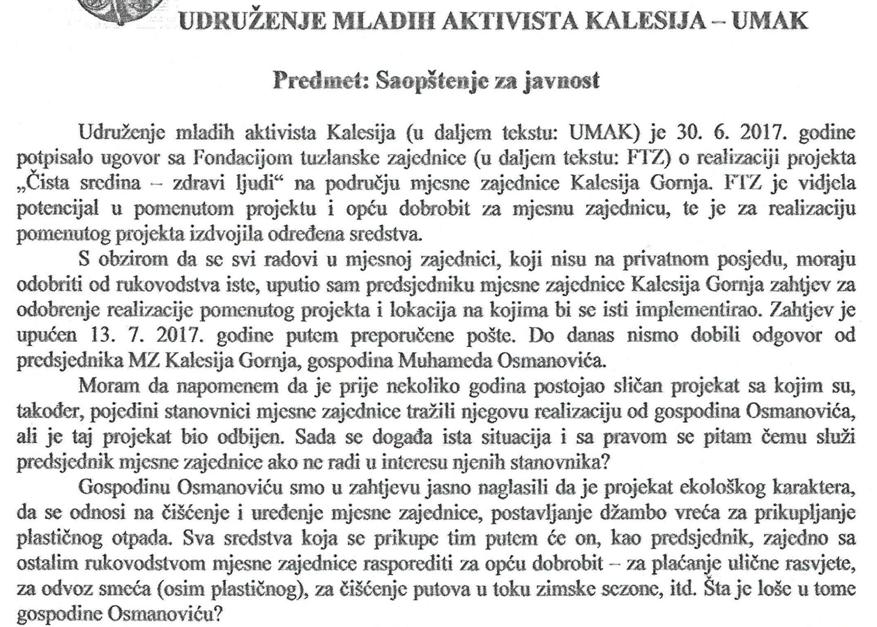 UMAK: Zbog sramotnog ignorisanja od strane predsjednika MZ Kalesija Gornja ne možemo realizovati projekat za koji smo dobili novac od Fondacije tuzlanske zajednice