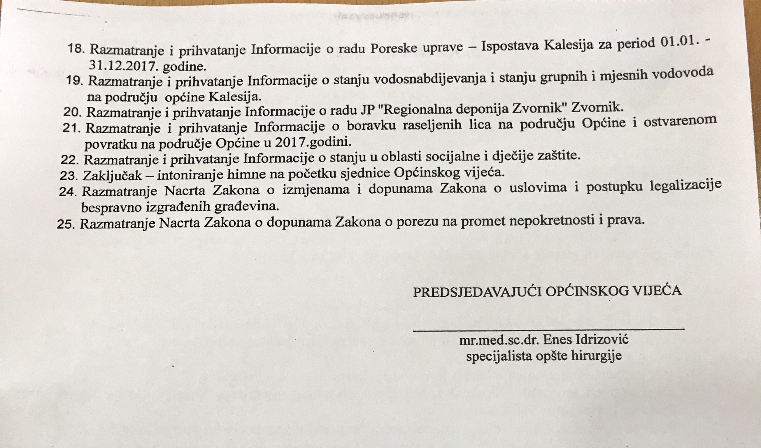 11:35 – Mujo Mujkić (Klub za bolju Kalesiju)- da se sa današnje sjednice vijeća povuku Izvještaj o radu načelnika I Izvještaj o izvršenju budžeta za 2017.godinu, jer načelnik nije prisutan na sjednici vijeća