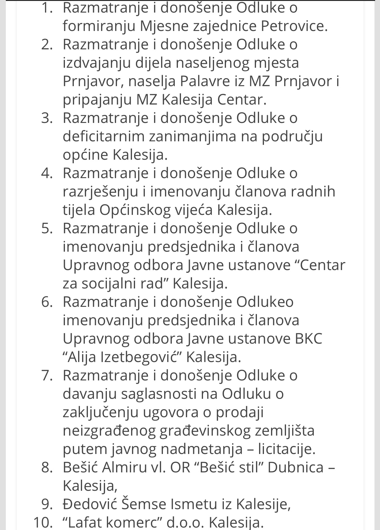 13:04 – Jednoglasno je usvojena Odluka o izdvajanju dijela naseljenog mjesta Prnjavor, naselja Palavre iz MZ Prnjavor i pripajanju MZ Kalesija Centar
