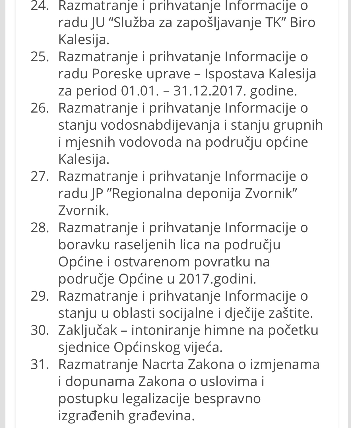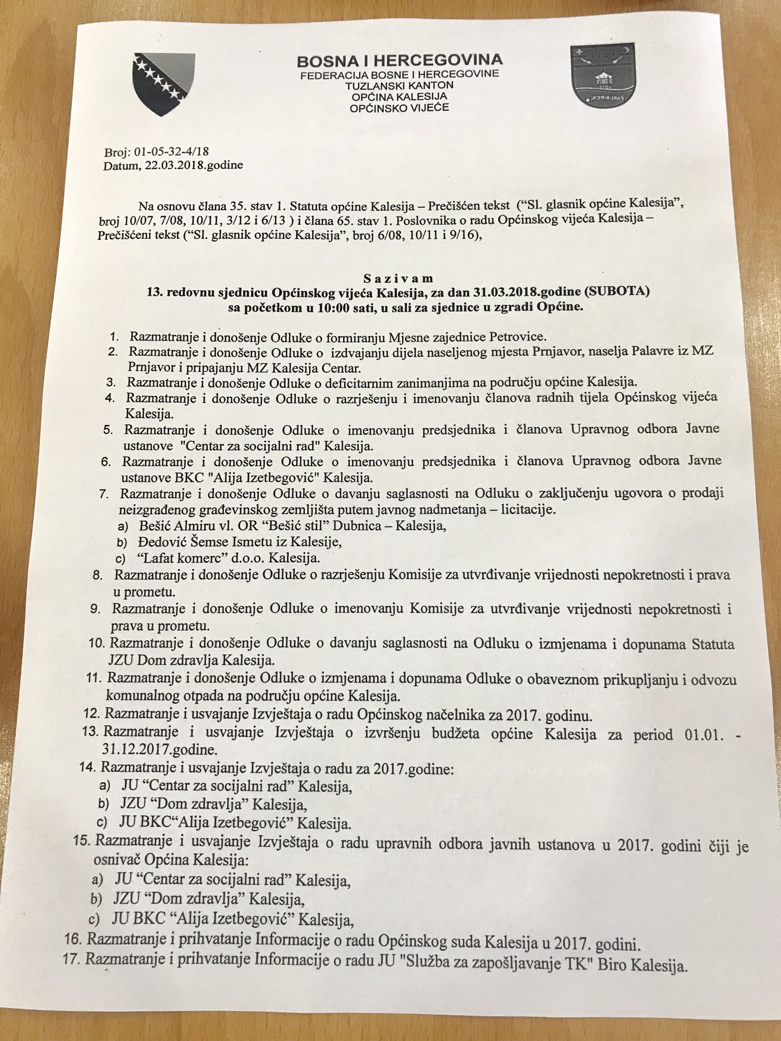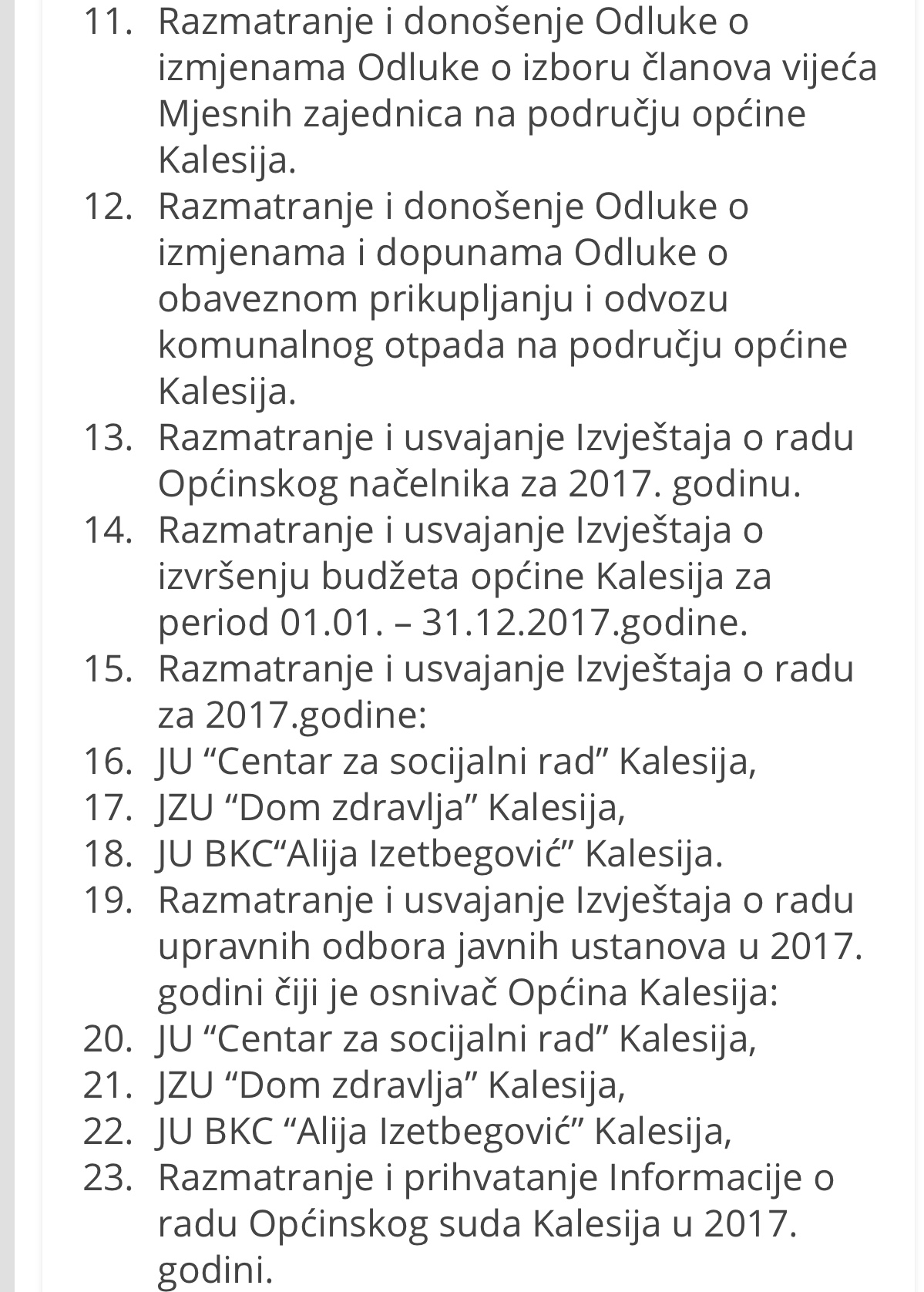 Na dnevnom redu je i Izvještaj o izvršenju budžeta za 2017. godinu, Odluka o osnivanju MZ Petrovice i Odluka o izdvajanju naselja Palavre iz MZ Prnjavor i pripajanje MZ Kalesija Centar.