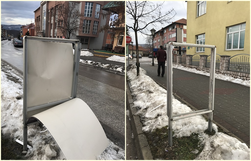 U noći sa četvrtka na petak (2./3.februara) u centru Kalesije za sada nepoznate osobe su polomili dva reklmna panoa u Ulici žrtava genocida u Srebrenici, pored pješačke staze uz Osnovnu školu.