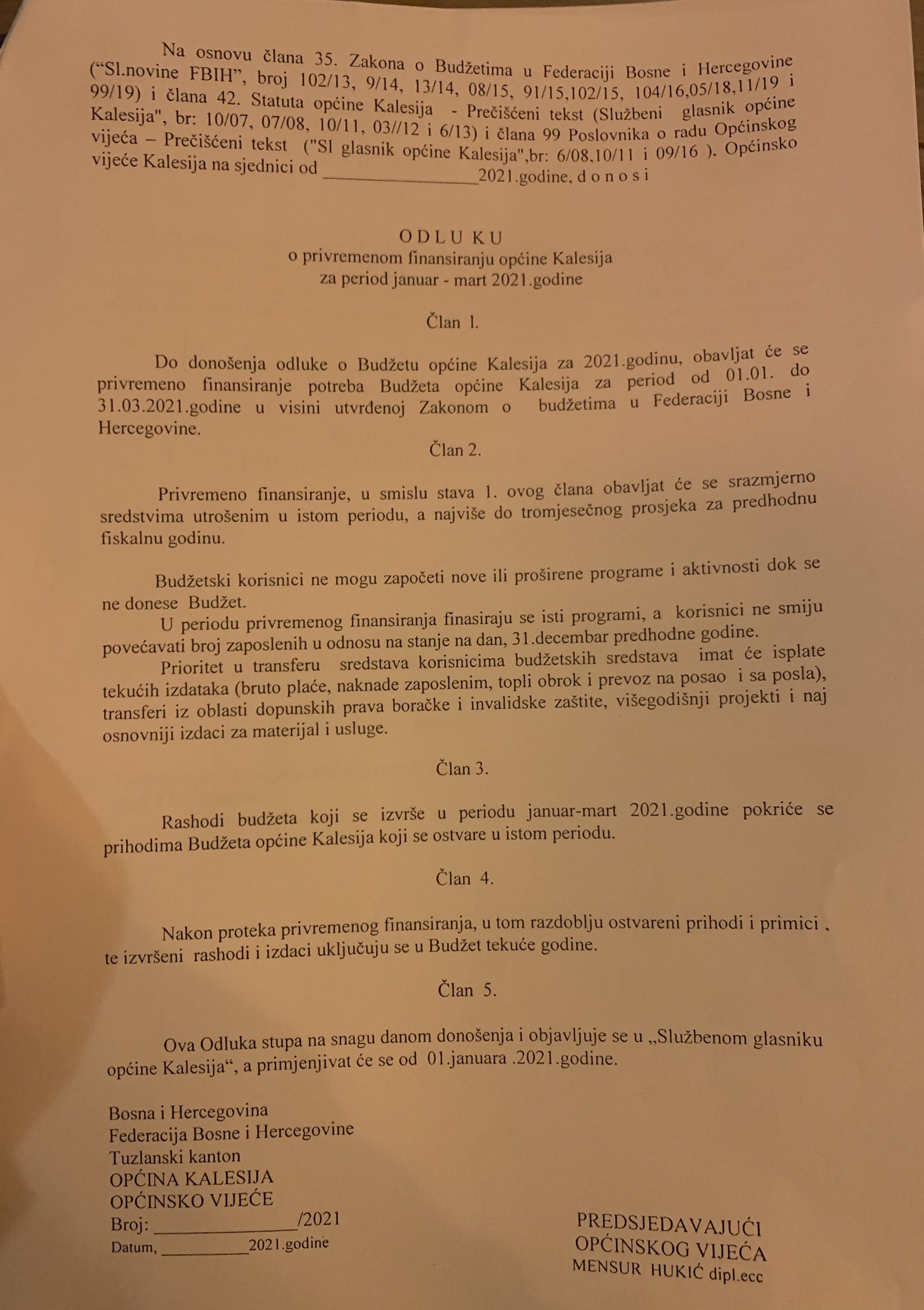 15.45 – Jednoglasno je usvojena odluka o privremenom finansiranju Općine Kalesija za period januar – mart 2021.godine.
