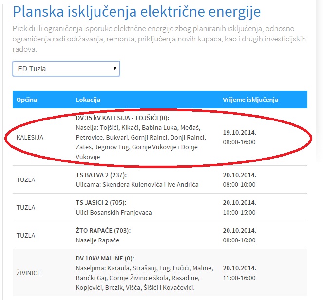 Obavještavamo korisnike elektro usluga da će u nedjelju (19.oktobra) u nekoliko kalesijskih naselja, zbog radova, doći do prekida napajanjem električne energije.