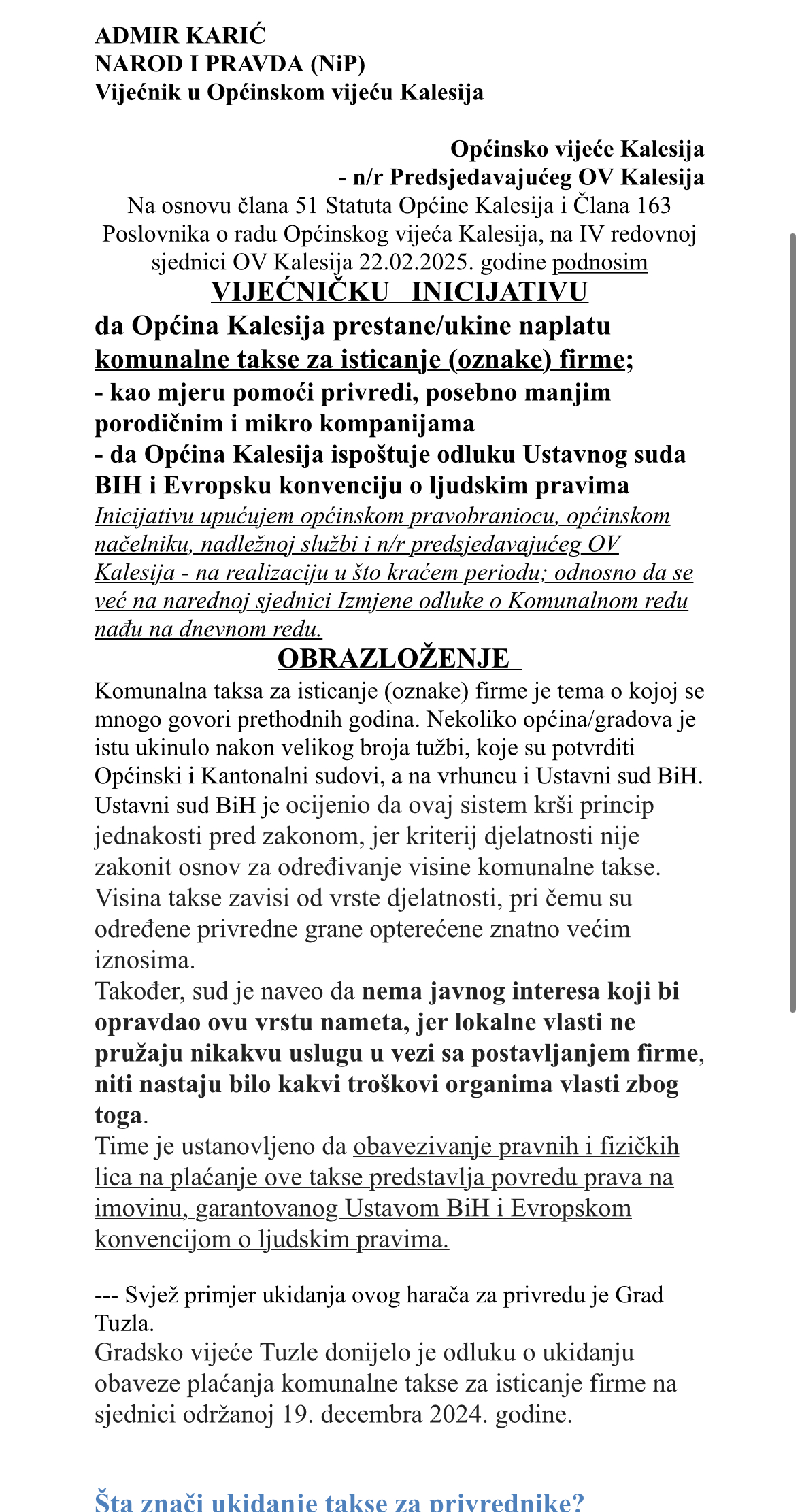 - Admir Karić (NiP) je za IV redovnu sjednicu OV Kalesija pripremio vijećničku inicijativu: da Općina Kalesija prestane/ukine naplatu komunalne takse za isticanje (oznake) firme;