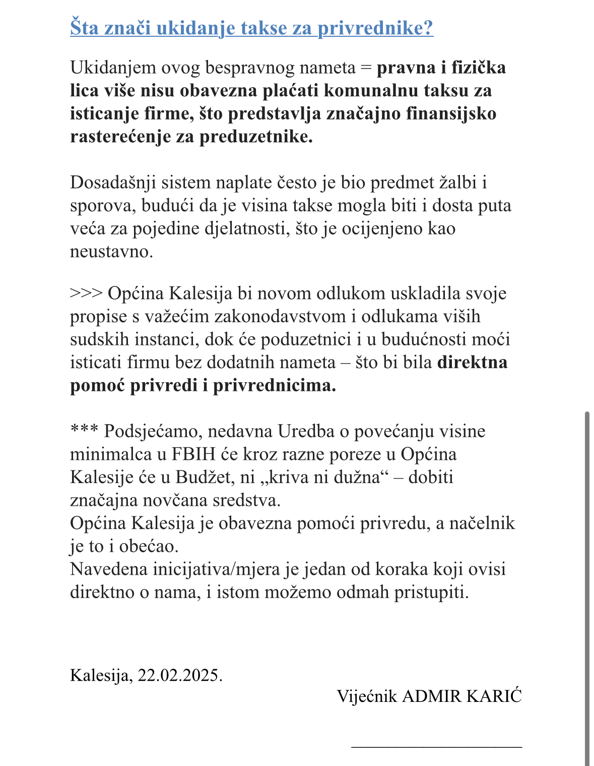 Karić je naveo da bi na ovaj način Općina Kalesija novom odlukom uskladila svoje propise s važećim zakonodavstvom i odlukama viših sudskih instanci, dok će poduzetnici i u budućnosti moći isticati firmu bez dodatnih nameta – što bi bila direktna pomoć privredi i privrednicima.