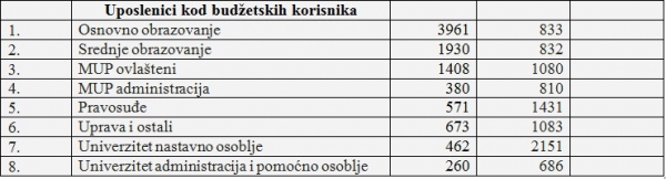 Najviše budžetskih korisnika zaposleno je u oblasti obrazovanja. Blizu šest hiljada zaposlenih ima posječno primanje od 833 (osnovno obrazovanje), odnosno 832 KM (srednje obrazovanje). Zaposleni budžetski korisnici u upravi mjesečno zarade 1.083 KM.