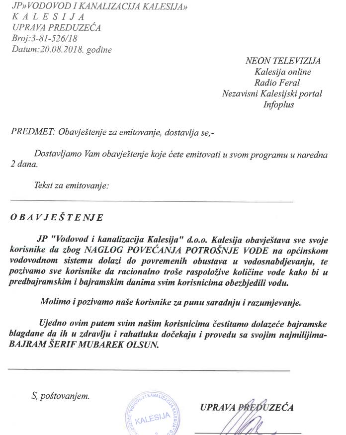 Home Kalesija Vodovod i kanalizacija Kalesija: “Povremena obustava u vodosnadbjevanju zbog naglog povećanja potrošnje... KalesijaNajaveNovostiBosna i HercegovinaSaopštenjaTOP TEME Vodovod i kanalizacija Kalesija: “Povremena obustava u vodosnadbjevanju zbog naglog povećanja potrošnje vode” By kaiser - 20. Augusta 2018. 848 0 SHARE Facebook Twitter Na adresu našeg portala je stiglo Saopćenje JP Vodovod i kanalizacija Kalesija. Saopćenje prenosimo u cjelosti… (NKP.ba)