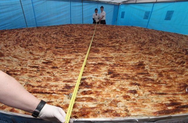 Burek teži oko 650 kilograma, što je između četiri i pet hiljada porcija, a šest sati je pripreman u lokalnom restoranu, čiji su kuhari razvili kilometar i po jufke.