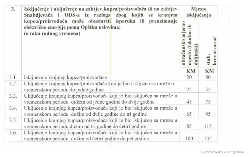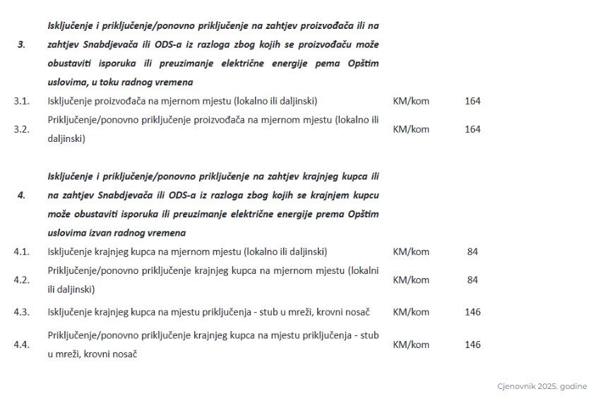 Cjenovnik za 2025. godinu donosi proširen tarifni okvir za isključenje i ponovno priključenje krajnjih kupaca i proizvođača električne energije, kako u redovnom, tako i u vanradnom vremenu.