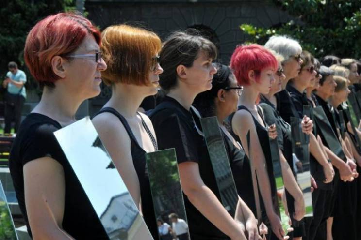 Žene u crnom u tišini su nosile 20 zrcala ogledala su željele poručiti da “Srbija u ogledalu vidi Srebrenicu i zato 20 ogledala za 20 godina”.