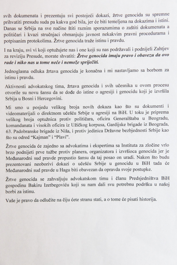 – Mi takvu podršku ne trebamo. Pridružite nam se kako su to učinile patriote ove države ili nas pustite da se sami borimo. Vaša prevelika briga za nas može poremetiti vašu ljepotu i mir u kome uživate, upravo zahvaljujući žrtvama genocida. Čak se ni beogradski režim ne usuđuje biti toliko drzak, kao što to čine pojedinci iz bošnjačkog naroda, posebno takozvani nezavisni bošnjački intelektualci, osporavajući pravo žrtvama genocida da podnesu zahtjev za reviziju i makar pokušaju doći do istine i pravde. Da li vi, veliki dušebriznici, znate da se u Beogradu i Hagu nalazi na hiljade dokumenata koji potvrđuju genocid u BiH, ali da ih „demokratski“ svijet dobro čuva i ne dozvoljava pristup tim dokazima? Da li znate da je genocid u BiH snimljen kamerama, pohranjen u arhivama velikih sila i dobro čuvan, ali žrtvama genocida nedostupan, kao što je embargo na naoružanje izglasan od „demokratskog“ svijeta zavezao žrtvama ruke i uskratio prava na samoodbranu, a pustio dželate da nas pokolju? – pitaju se žrtve genocida.